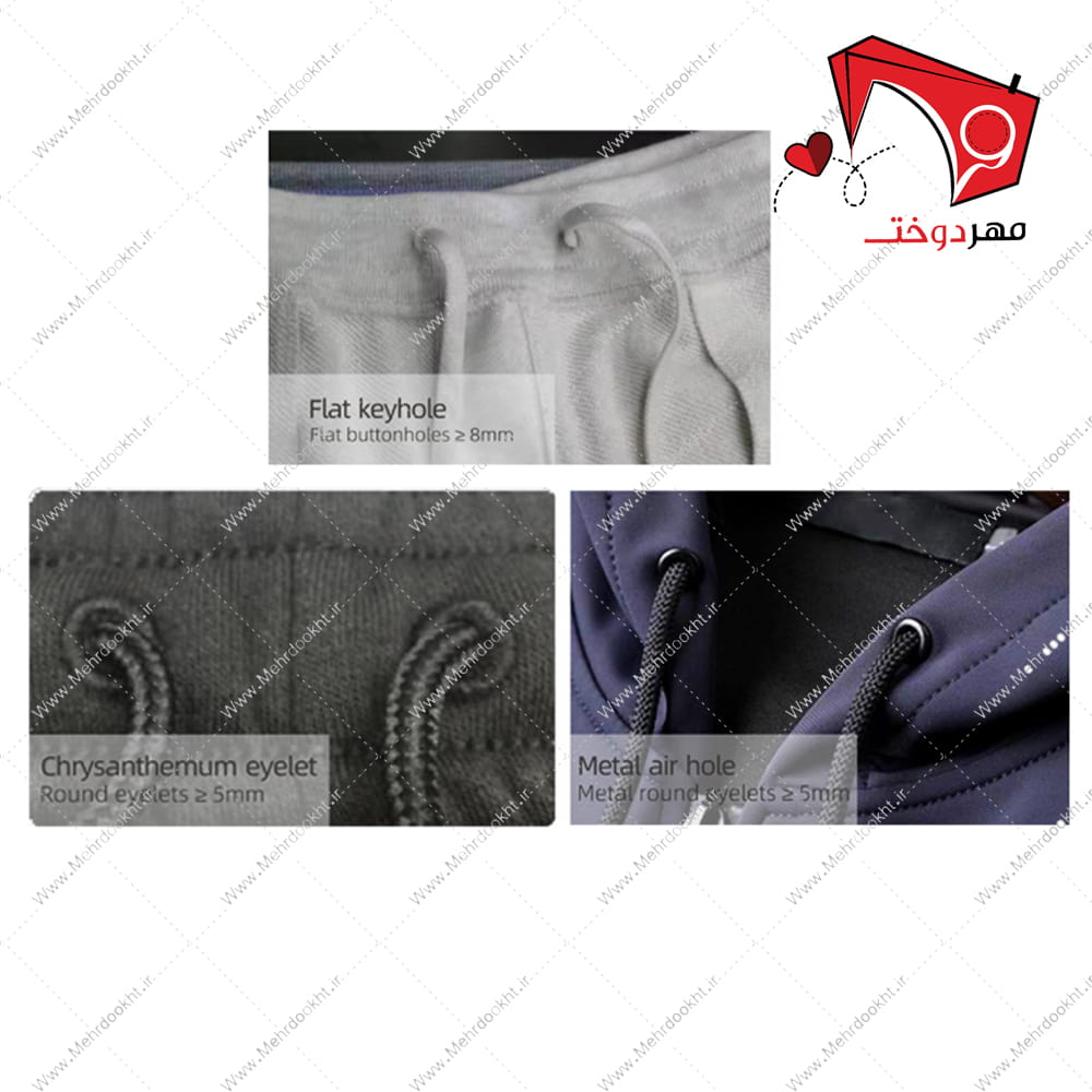 - قابلیت رد کردن بند داخل شلوارهایی با ورودی بند جادکمهای، جادکمهی چشمی، حلقهی فلزی، سوراخ با دوخت دور گرد